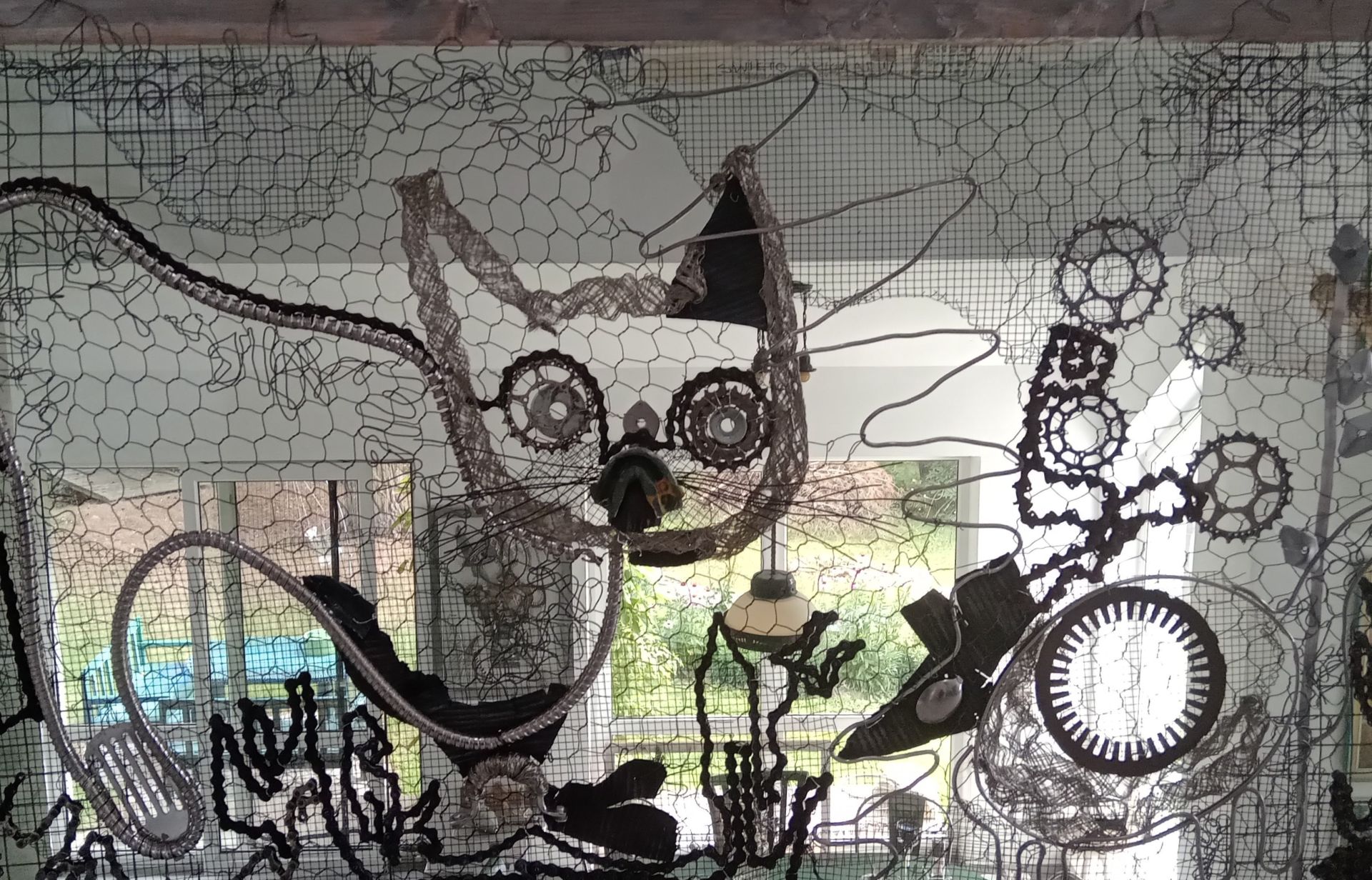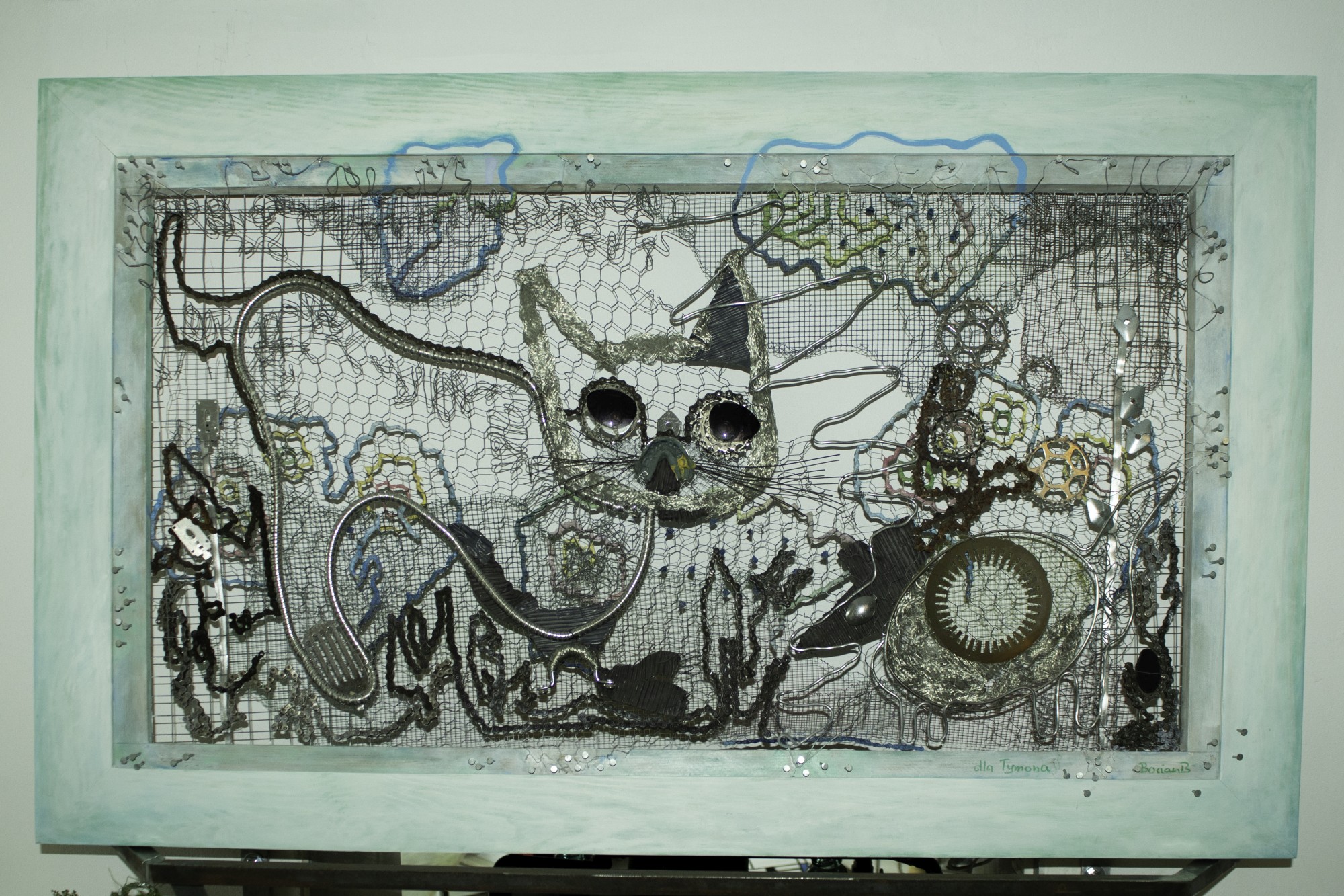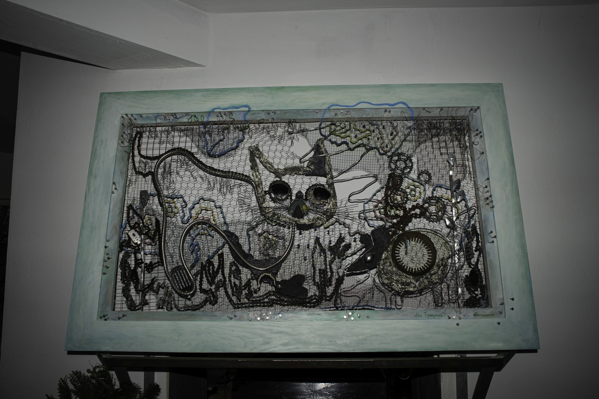 (D) Diverse Metallelemente und Pappmaschee auf Maschendraht